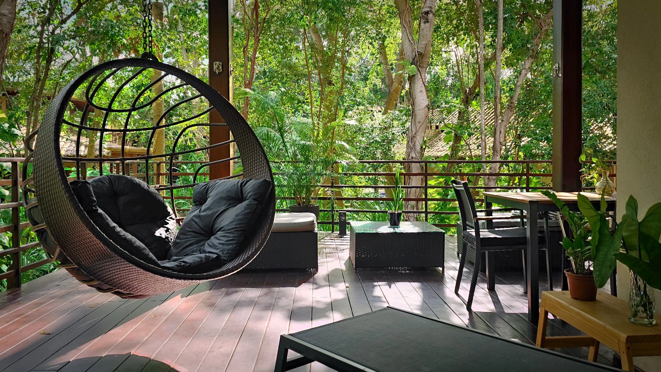 The ground floor features an open-plan kitchen, a cozy bedroom with double beds, a powder room, and a guest bathroom. Upstairs, the master suite opens to a private, decorated balcony—ideal for enjoying the canopy views. An additional suite provides ample space for family or guests, and the flexible layout allows for expanding the second bedroom if desired.