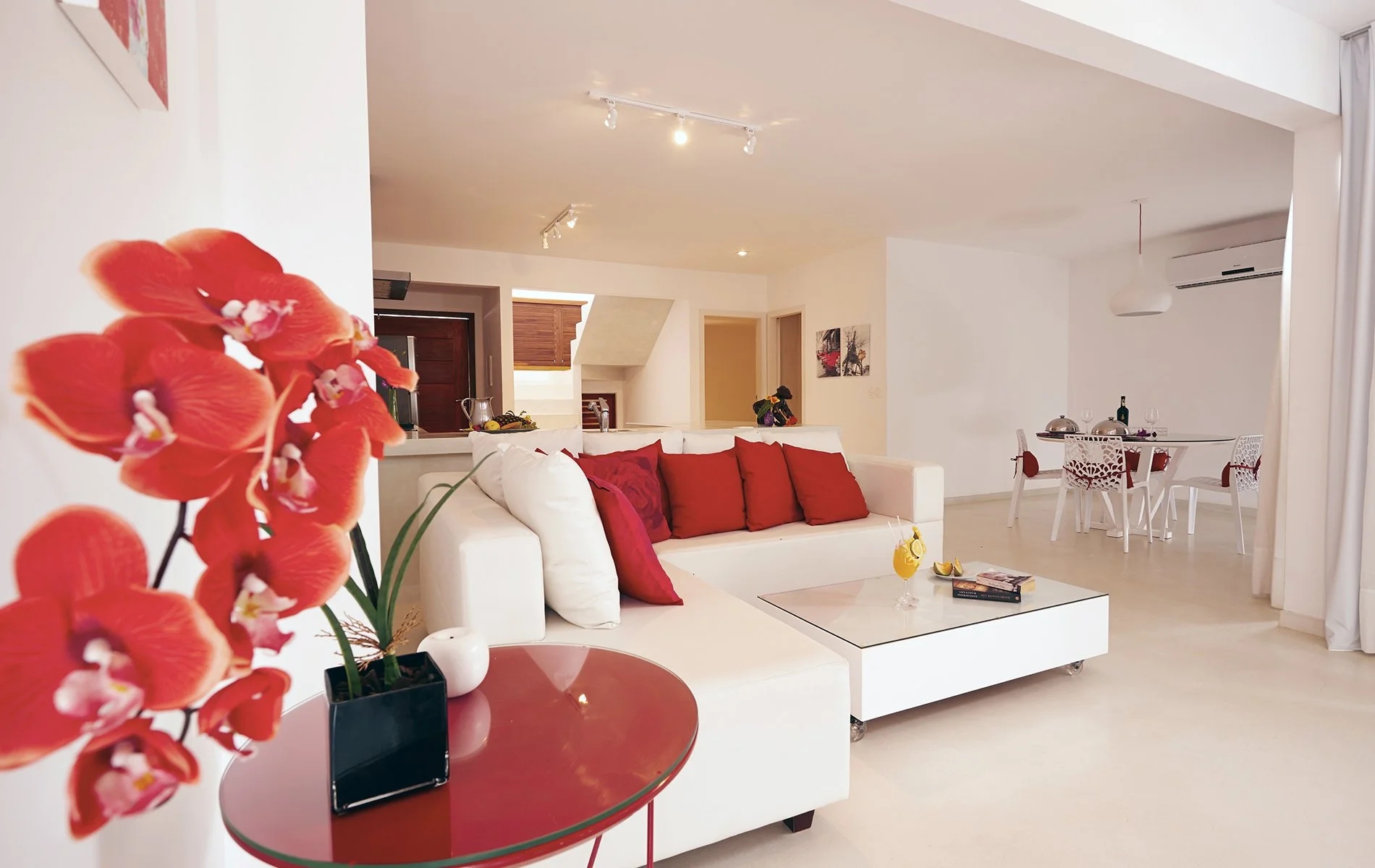 The modern minimalist style architecture offers panoramic sea views with a spacious lounge, a central table, flat screen TV, sofa.